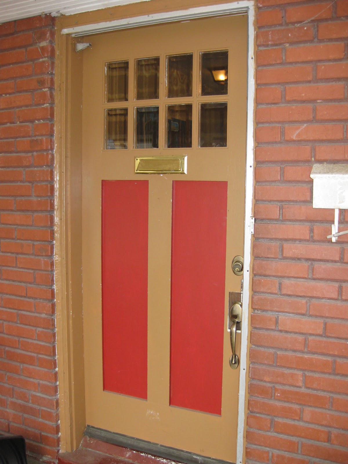 Look at the ugliness. The silver frame is one's left over from an old screen door. Long gone before we moved in. Same goes for the hinge on the top left. The mail slot has been removed (see below) but the ugly baby poop brown and red combo has to go! We bought new hardware when we moved in so you can see the original brown of the door underneath where a brass rectangle thing was that had to be removed. |